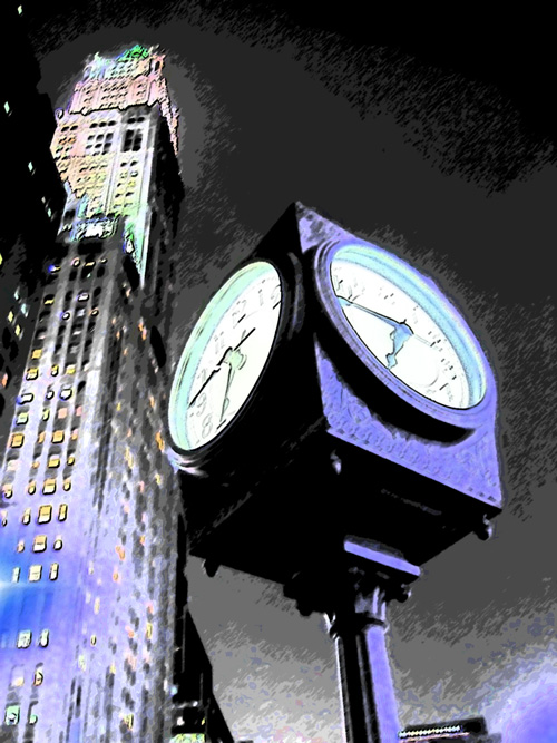 To their left was a large park sitting below the white colonial style New York City Hall. Below them was the intersection of Broadway and Park Row, which the squirrels agreed was the widest stretch of road they had ever seen.Almost in the middle of the intersection, on a small island of its own, was a small clock tower with four large white illuminated faces telling the area it was nearly half past three in the morning.